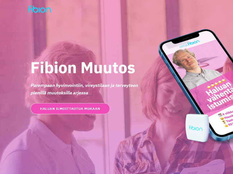 Fibion on hyvinvointiteknologian kasvuyritys, jonka juuret perustuvat Jyväskylän yliopiston liikuntabiologiseen tutkimustyöhön. Fibion-sensori kerää kiihtyvyysanturitekniikkaa hyödyntäen tietoa reiden liikkeestä ja mitatusta datasta laaditaan tarkka kartoitus arjen aktiivisuussisällöstä valveillaoloaikana. Jo vuodesta 2014 Fibion on auttanut ihmisiä oivaltamaan pienten arkitottumusten muutosten hyödyt terveydelle. Interaktiivisen tavoitetyökalun avulla voit nähdä pientenkin muutosten positiivisen vaikutuksen! Jo pelkästään tauottamalla istumista tehokkaammin, on mahdollista saavuttaa suuria hyötyjä kokonaisterveydentilalle.